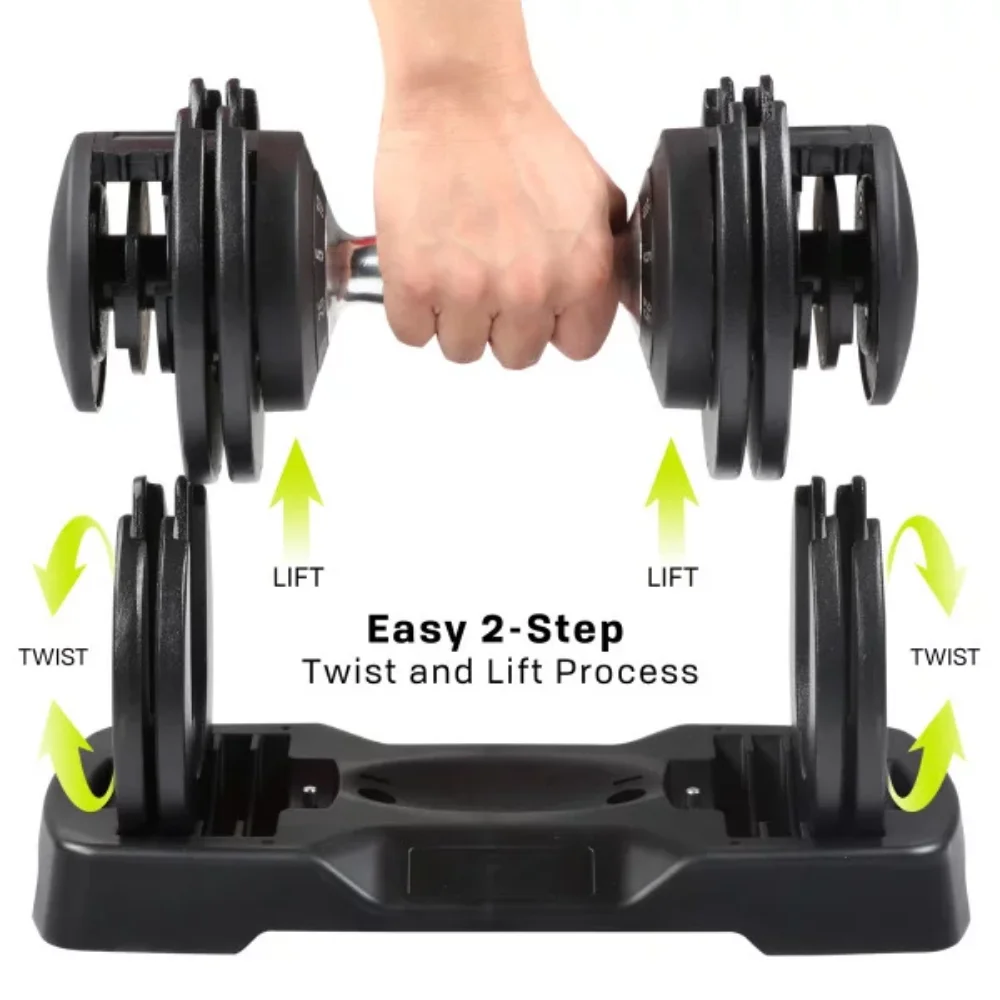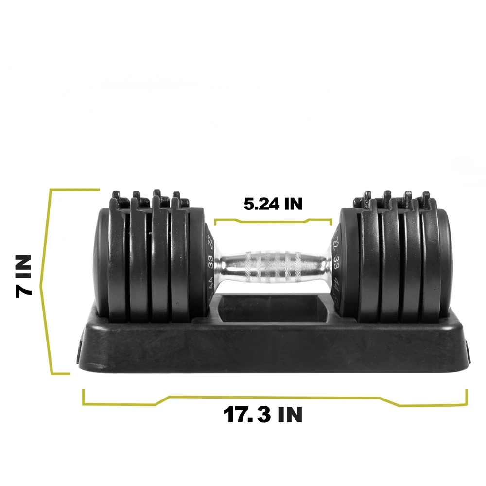 55lbs (25kgs) Adjustable Dumbbell is offered in multiple weight levels for you to choose from and its chrome contoured handle design allows this dumbbell to fit any free weight and strength training exercise at home or group workout with training partners! Our adjustable dumbbell has functional details such as textured handle for a tight and secure grip, built-in rotating dial system on the handle for weight plate adjustment from 5lbs, 11lbs, 22lbs, 33lbs, 44lbs to 55lbs, and a compact weight tray to save your space in your home gym. PRCTZ LLC has been the fitness training accessory and equipment expert since 1986, and all our products are 100% safety regulated being the #1 trusted choice by exercisers at any skill levels. We continue to innovate and create new ways to encourage active and healthy lifestyle.
